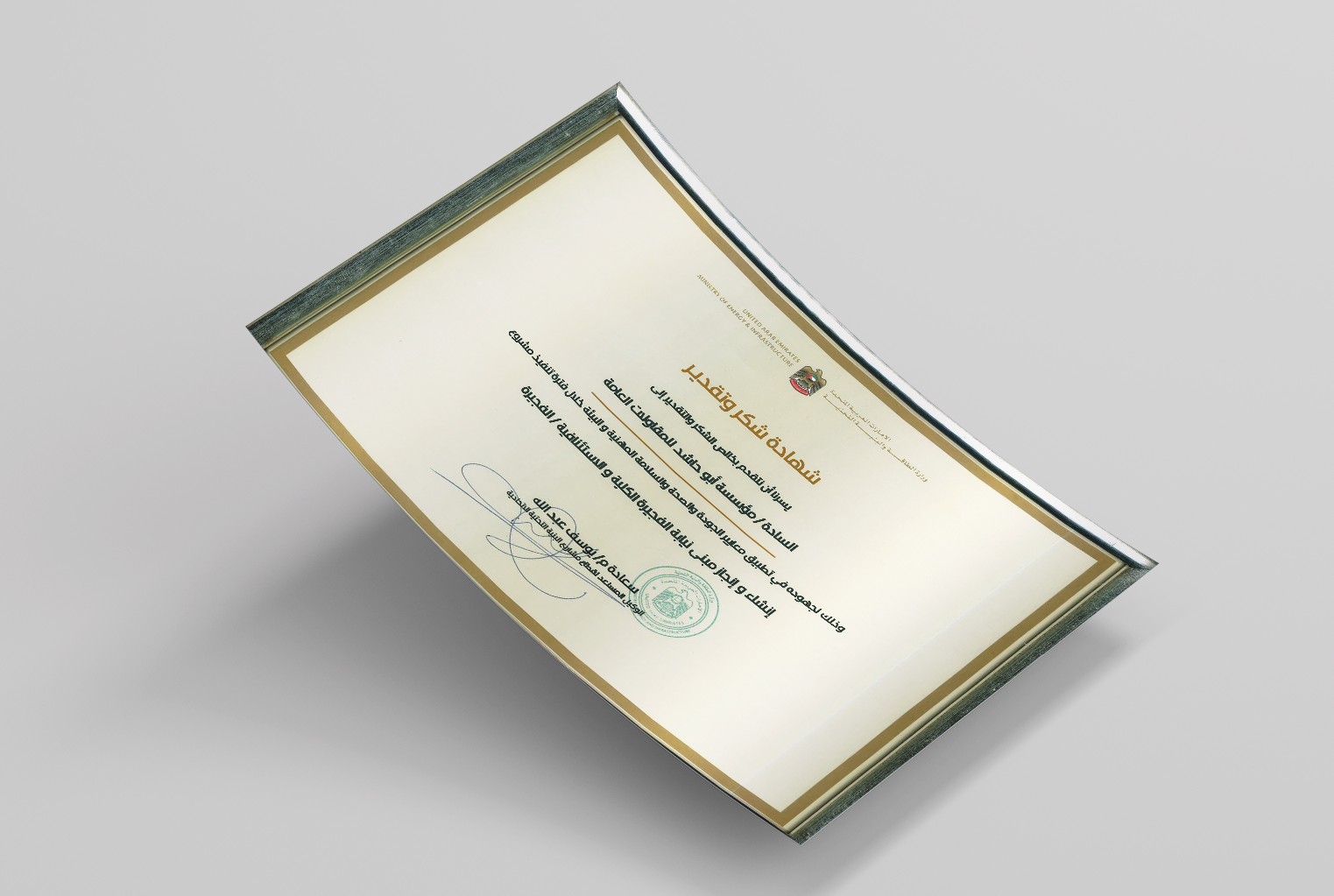 شهادة شكر وتقدير من وزارة الطاقة و البنية التحتية