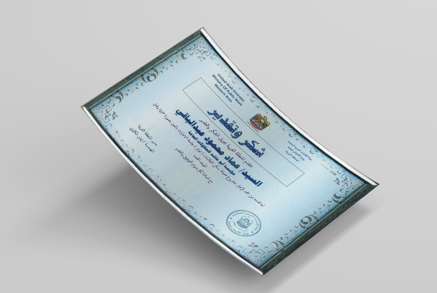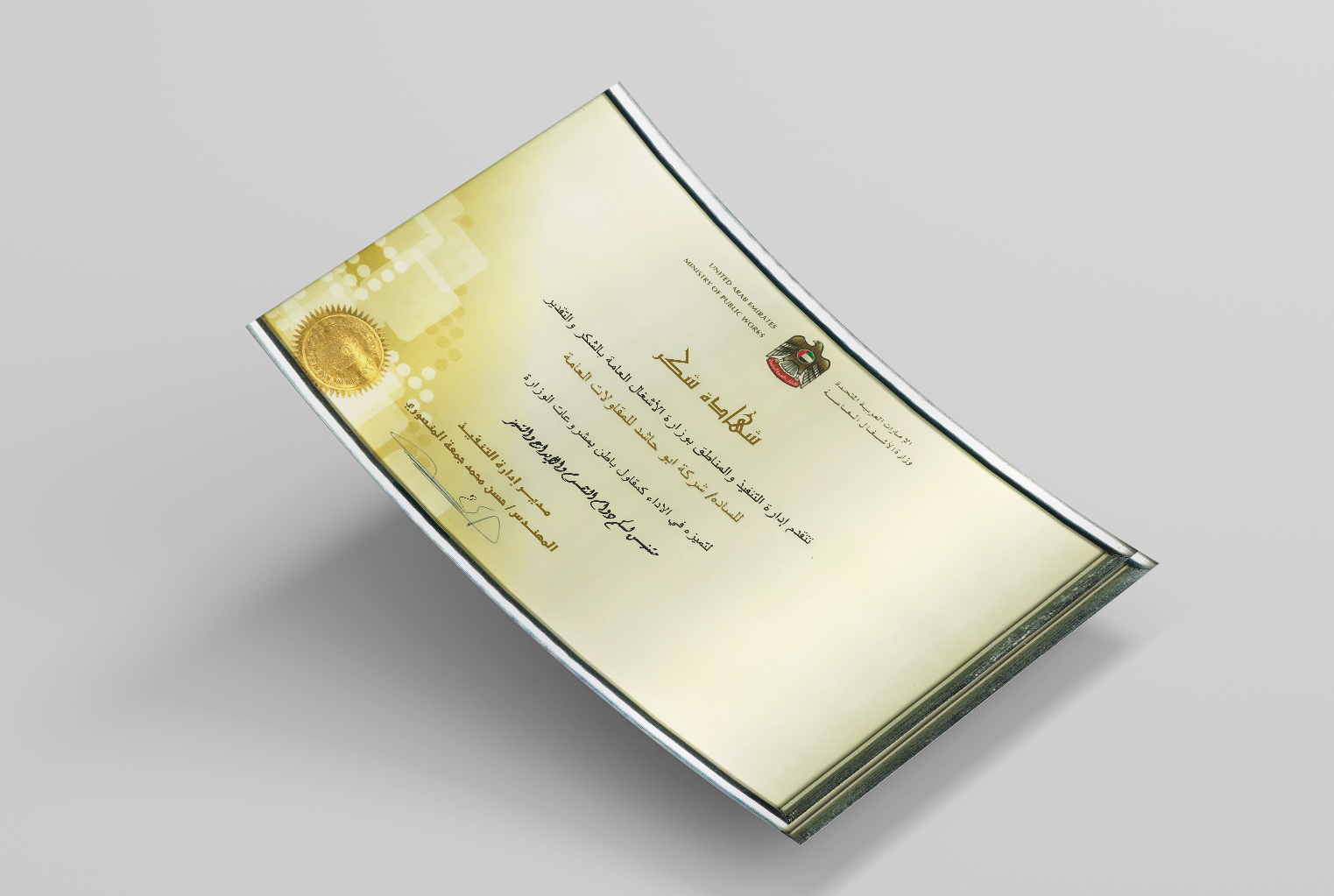 Certificate of Appreciation and Recognition from the Ministry of Public Works.