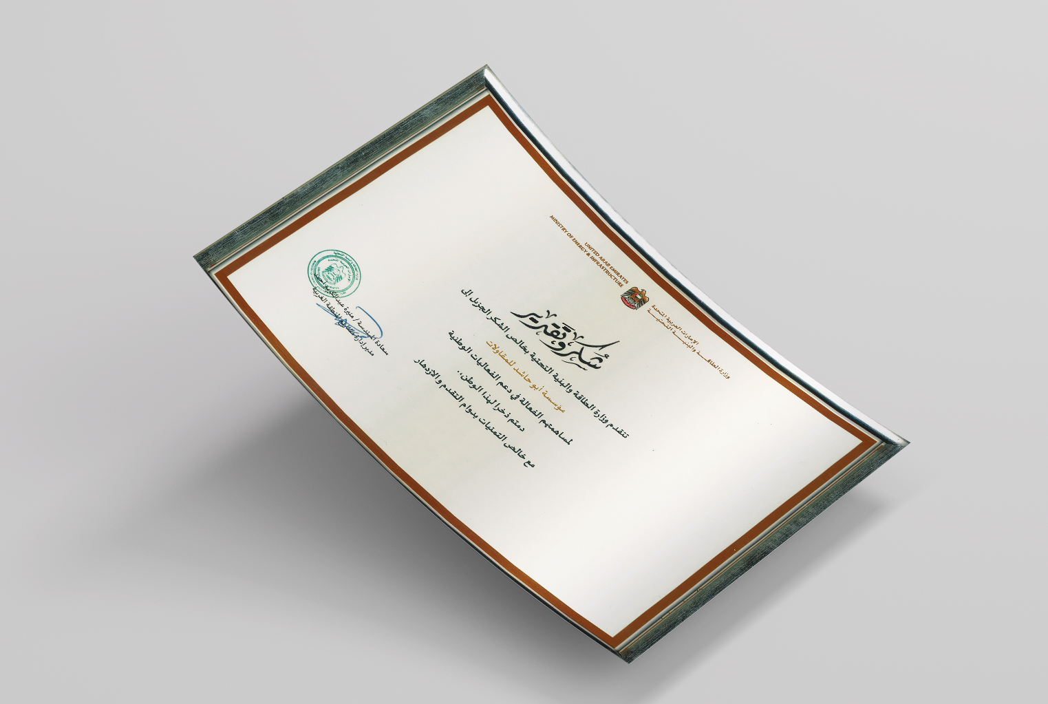 Certificate of Appreciation and Recognition from the Ministry of Energy and Infrastructure.